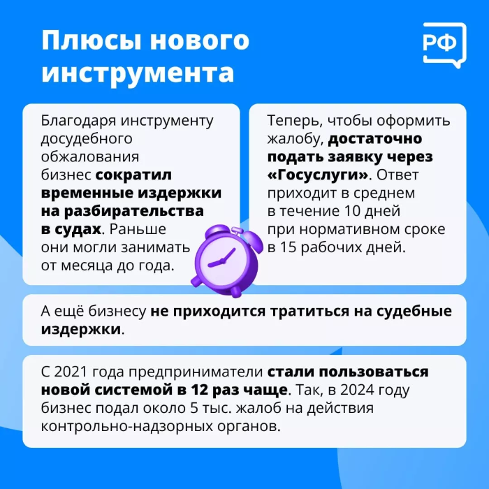 Введение инструмента досудебного обжалования — важный этап реформы контрольно-надзорной деятельности, благодаря которой сокращается административное давление на бизнес.