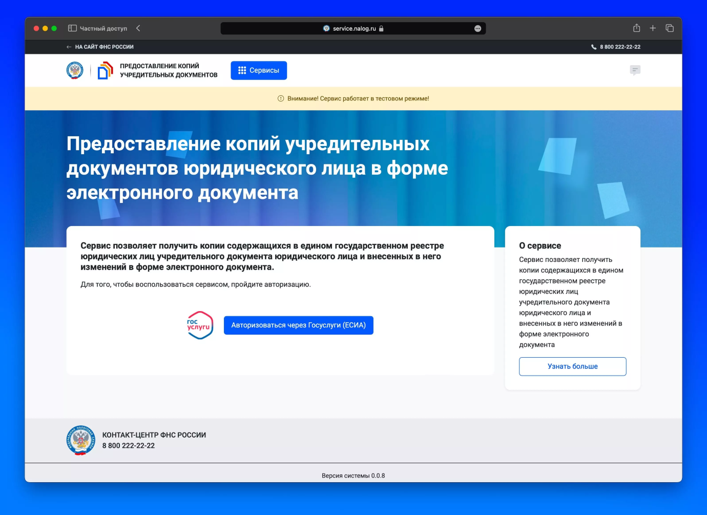 Сервис работает в тестовом режиме. Если запрашиваемые документы с помощью сервиса получить невозможно, то пользователь может обратиться в регистрирующий орган по месту нахождения юридического лица для получения необходимых документов на бумаге в порядке, предусмотренном приказом Минфина России от 05.08.2019 № 121н.