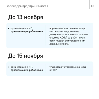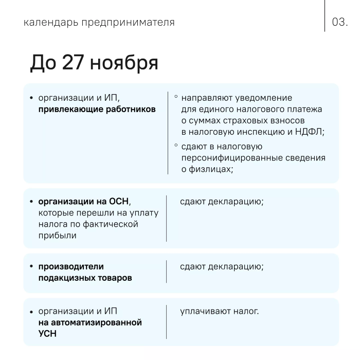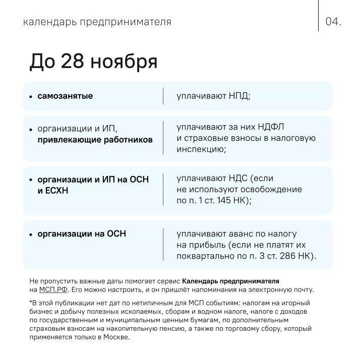 | Налог на прибыль организаций | - уплата второго аванса в IV квартале; - уплата аванса за октябрь; - уплата аванса организациями бывшими участниками КГН; - уплата налоговыми агентами по полученным дивидендам и процентам по государственным и муниципальным ценным бумагам; - уплата налоговыми агентами по выплаченным денежным средствам, иному доходу иностранной организации; - уплата аванса при превышении выручки 5 млн руб.; - уплата налога с доходов по государственным и муниципальным ценным бумагам |
