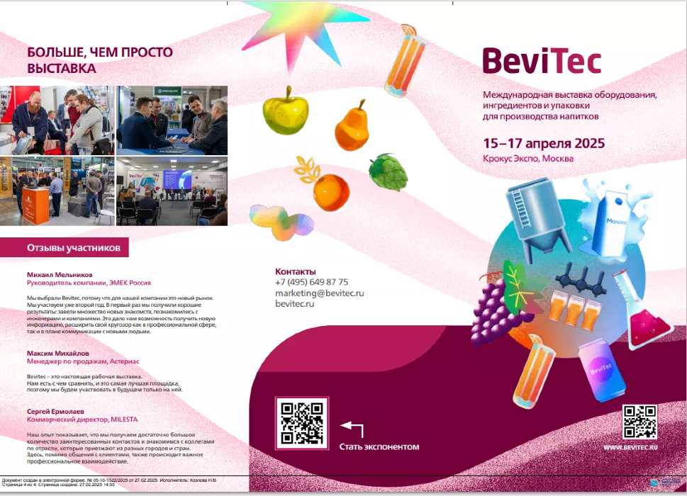 Комитет по агропромышленному и рыбохозяйственному комплексу Ленинградской области информирует, что в период с 15 по 17 апреля 2025 года в МВЦ «Крокус Экспо», Москва состоится Международная выставка оборудования, ингредиентов и упаковки для производства напитков BeviТес (далее – Выставка).