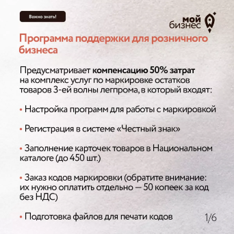 - Программу компенсации 50% затрат на комплекс услуг по маркировке остатков товаров 3-ей волны для розничного бизнеса