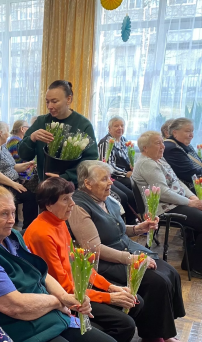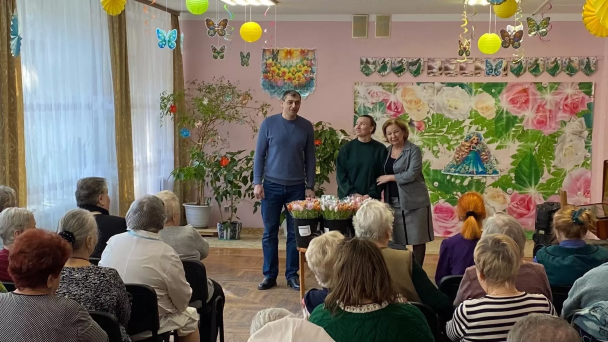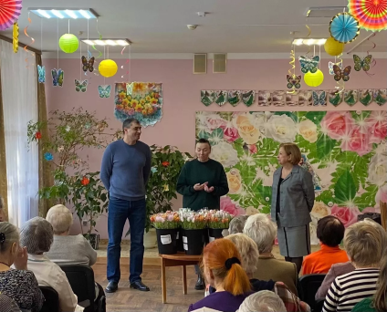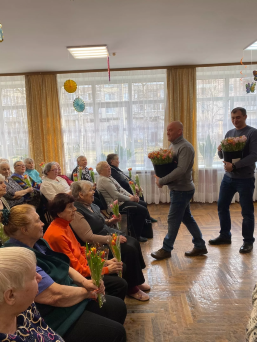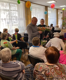 Глава Общественной палаты Киришского муниципального района и его заместитель совместно с руководителем цветочного салона «Апрель» Ириной Юрьевной Николаевой поздравили женщин-сотрудниц и посетителей Киришского центра социального обслуживания с Международным женским днём.
