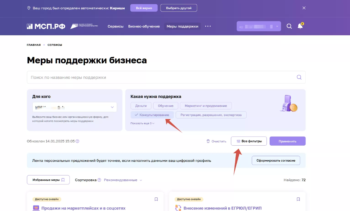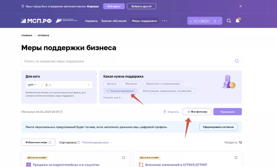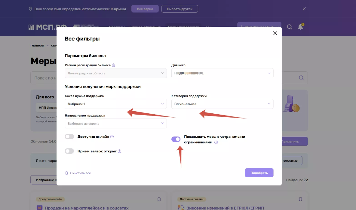 5. В фильтрах отмечаем галочкой "Какая нужна поддержка" - Консультирование, "Категория поддержки" - Региональная, сделать активный флажок на "Показывать меры с устранимыми ограничениями" и нажать "Подобрать".