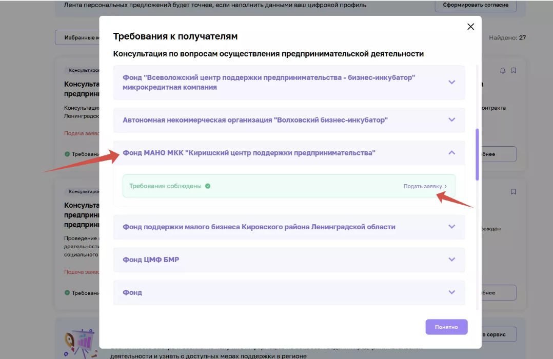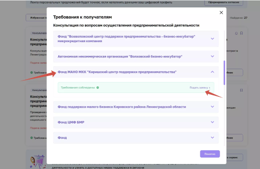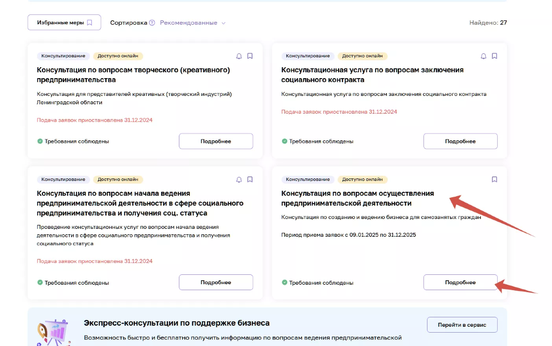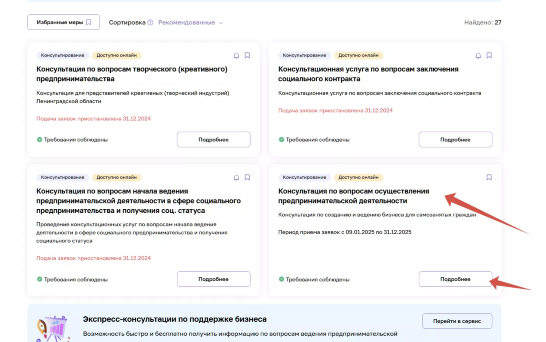 6. В высветившихся мерах поддержки выбрать активную услугу "Консультация по вопросам осуществления предпринимательской деятельности" и нажать "Подробнее"
